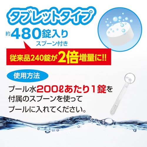 家庭用プールに便利なタブレットタイプ。必要量を投入するだけで手軽に塩素消毒ができます。